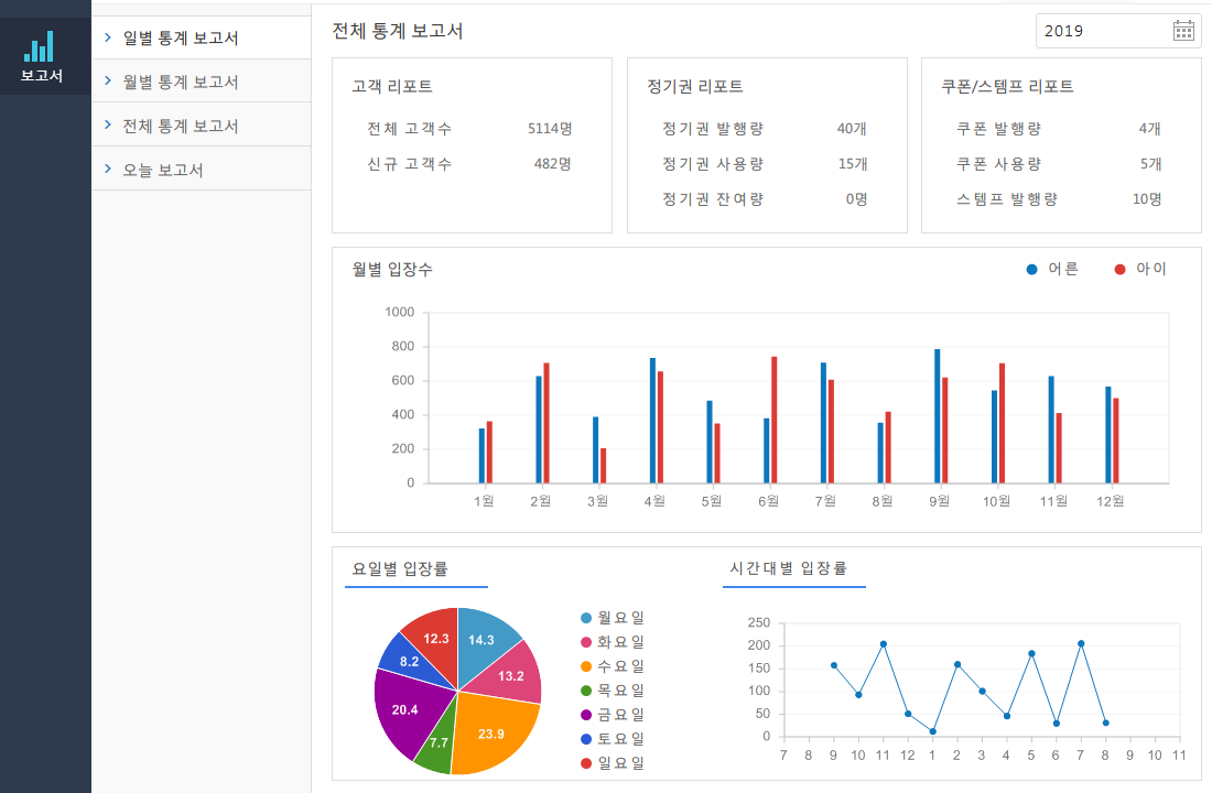 정기권 발행 정보와 쿠폰 발행정보와 시간별 요일별로 입장 고객의 현황을 파악 하실수 있습니다.